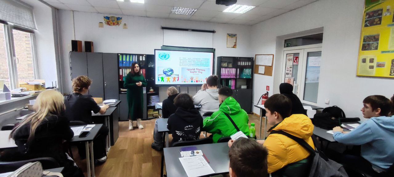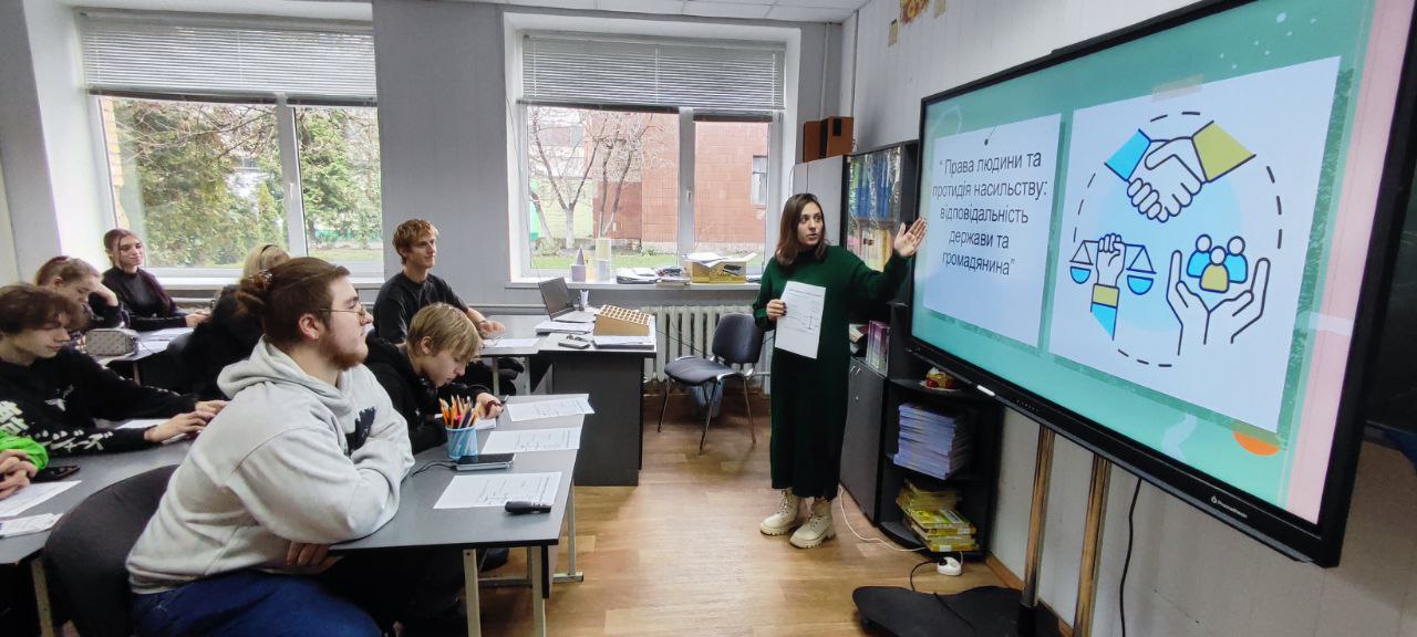Під час заняття здобувачам освіти було представлено інформативну презентацію, у якій висвітлено ключові поняття про права людини, механізми їх захисту та роль кожного громадянина у запобіганні насильству.